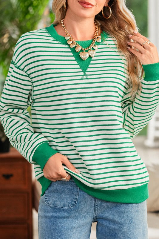 Green Striped Long Sleeve Top with Contrast Binding – Drop Shoulder Relaxed Fit